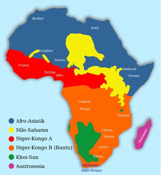 - Selain bahasa lokal, di Afrika juga dipakai berbagai bahasa yang diwarisi dari zaman penjajahan. Misalnya, bahasa Perancis, Inggris, Spanyol, Portugal, dan Italia. Kata Afrika berasal dari bahasa Latin, Aprica yang berarti ‘bersinar’ atau bahasa Yunani Aphrike yang berarti ‘tanpa dingin’.